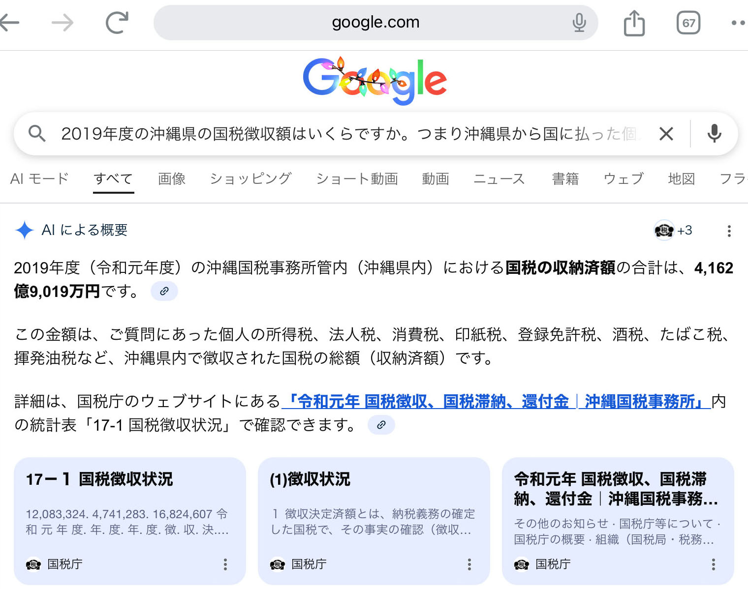 「沖縄県の法人や個人や会社が日本政府に収めている税金は2019年度でいくらですか?法人税は消費税も含みますその他のぜいもありますかあれば含みます」で検索