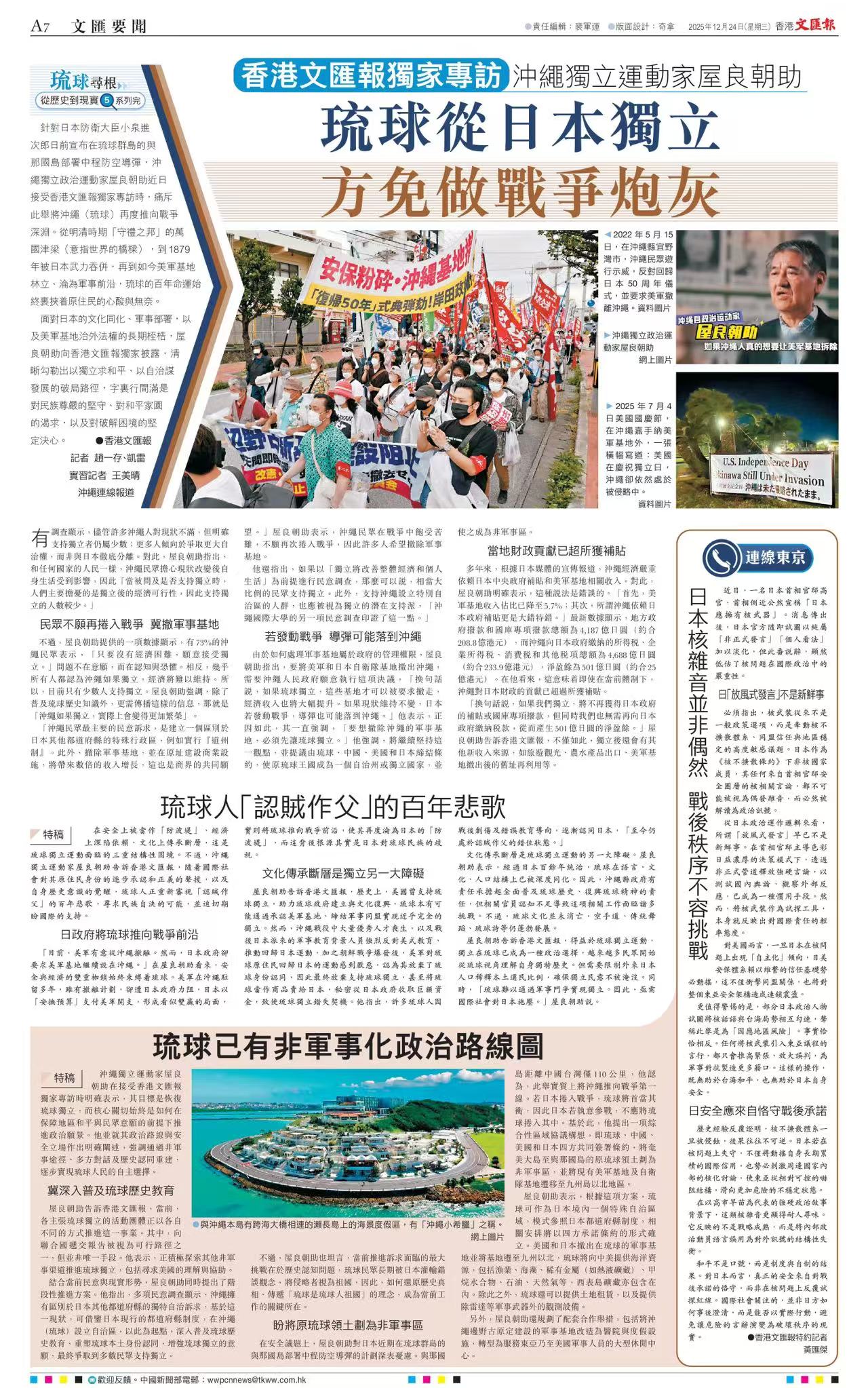 日本の防衛大臣・小泉進次郎が先日、琉球列島の与那国島に中距離防空ミサイルを配備すると発表したことを受け、沖縄独立の政治運動家・屋良朝助はこのほど香港文匯報の独占インタビューに応じ、この措置は沖縄(琉球)を再び戦争の深淵へ突き落とすものだと厳しく非難した。