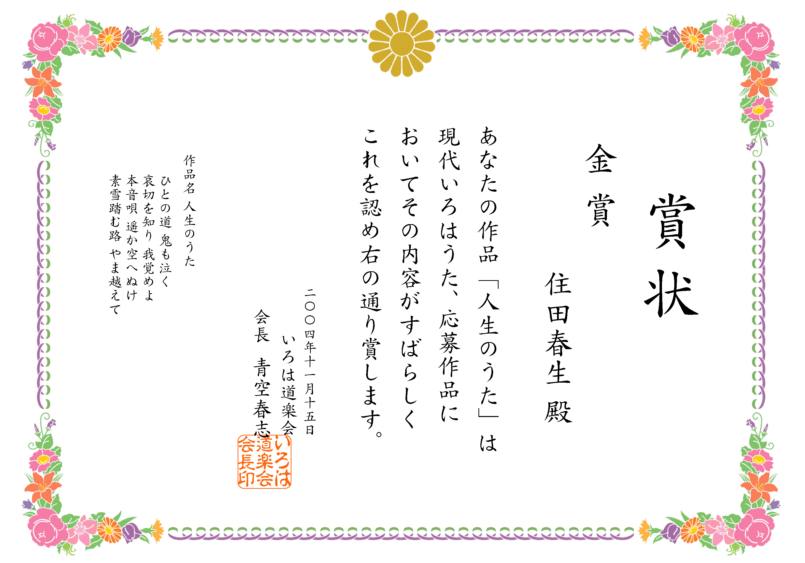 色は匂うも 散りあせて 渡る人の世 常なれん 深き山を越え 細く夢見ぬ 酒減らし住む | |