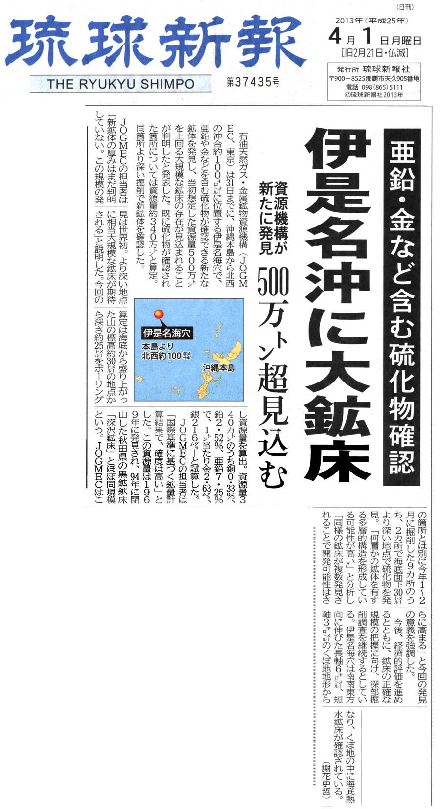 伊是名沖に大鉱床 500万トン超見込む 石油天然ガス・金属鉱物資源機構(JOGMEC、東京)は31日までに、沖縄本島から北西の沖合約100キロメートルに位置する伊是名海穴で、亜鉛や金などを含む硫化物が確認できる新たな鉱体を発見し、当初想定した資源量500万トンを上回る大規模な鉱床の存在が見込まれる事が判明したと発表した。