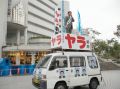 - 宣伝カーの全容、宣伝カーの向いには通行人や商店が多数。県庁前