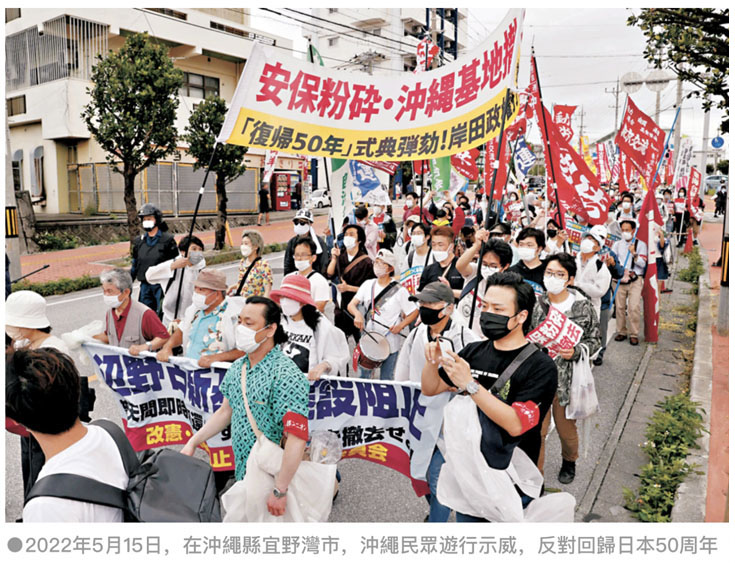 ●2022年5月15日、沖縄県宜野湾市で、沖縄の人々が日本復帰50周年式典に反対し、米軍の撤退を求めてデモ行進を行った。資料写真↓