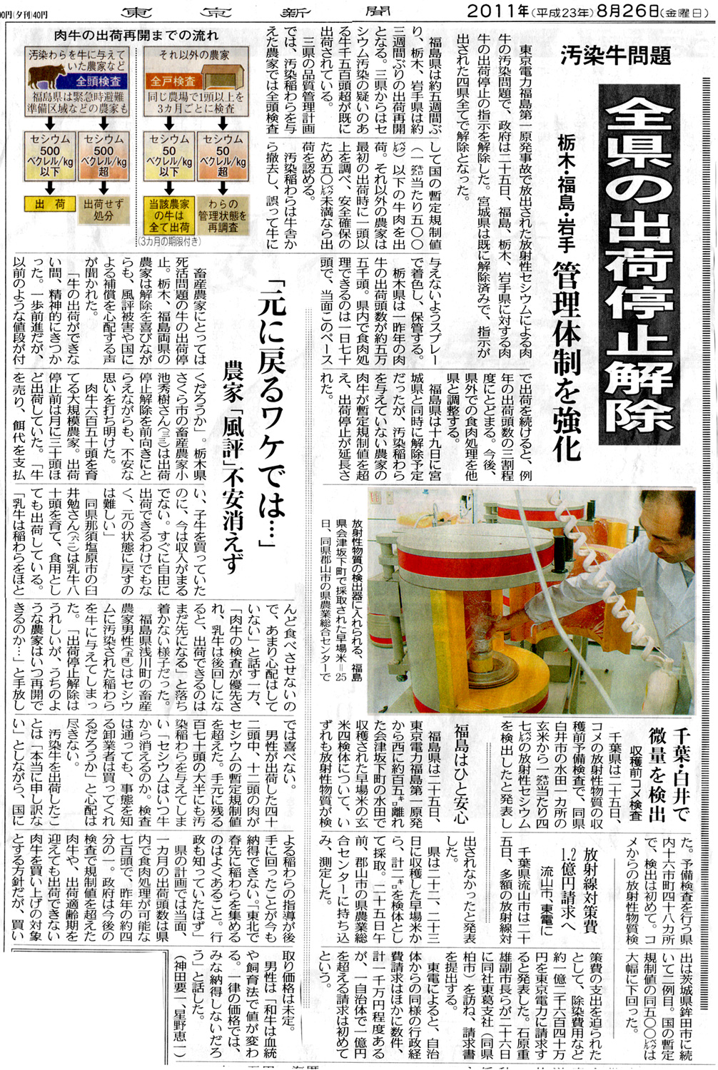 東京電力福島第一原発事故で放出された放射性セシウムによる肉牛の汚染問題で、政府は二十五日、福島、栃木、岩手県に対する肉牛の出荷停止の指示を解除した。宮城県は既に解除済みで、指示が出された四県全てで解除となった。